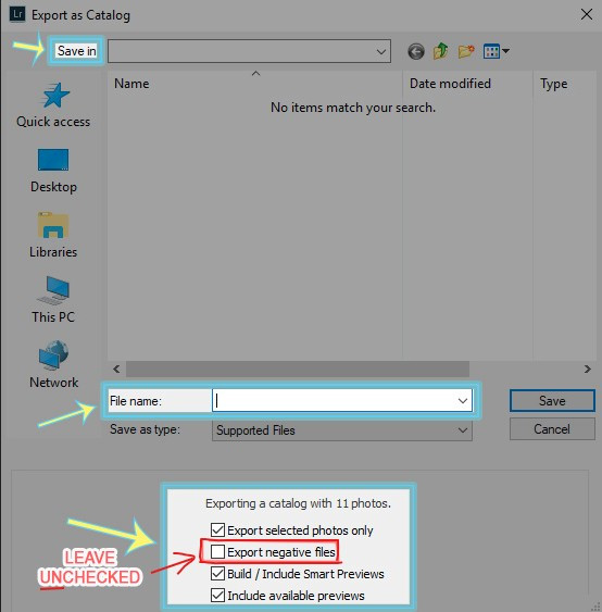3. While the photos are selected, go to File>Export As Catalog. When the menu window pops up, choose a location on your computer and give it a new name (for example: “smith-wedding-outsource”). Make sure that only the check-boxes are selected exactly like the image example below. The option for “export negative files” should not be checked. Click Save.