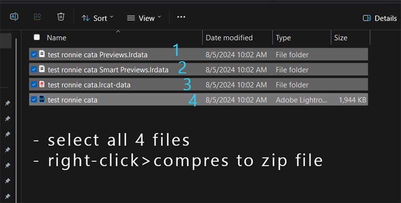 5. Go to the location where you just saved the catalog in step 3, select all the items, and compress them (right click>compress to zip file). This will create a compressed folder; this is the folder that needs to be sent to me. Note: you might see 3 or 4 items, either amount is ok.